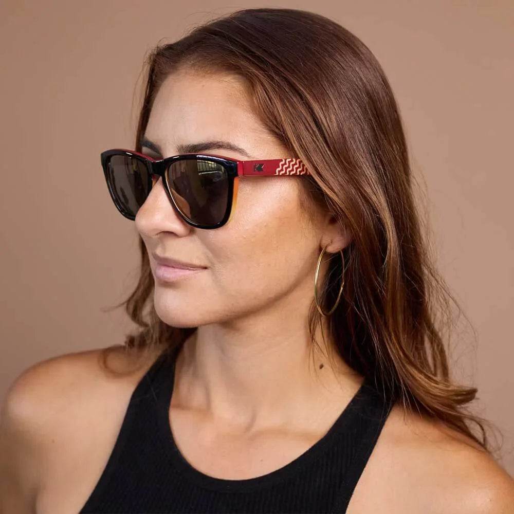 Savor style with the Knock Ramen Premiums, featuring perfectly noodle-textured red-to-orange gradient arms and accented by an elegant black frame front. Look through golden polarized lenses reflecting the rich hues of ramen broth, complete with a playful chopsticks-and-noodles lens etch. Wrapped up in a custom ramen packaging microfiber pouch, these sunglasses serve up polarized flavor with every glance. Perfect for noodle connoisseurs, these shades are a delicious addition to any sun-soaked adventure.