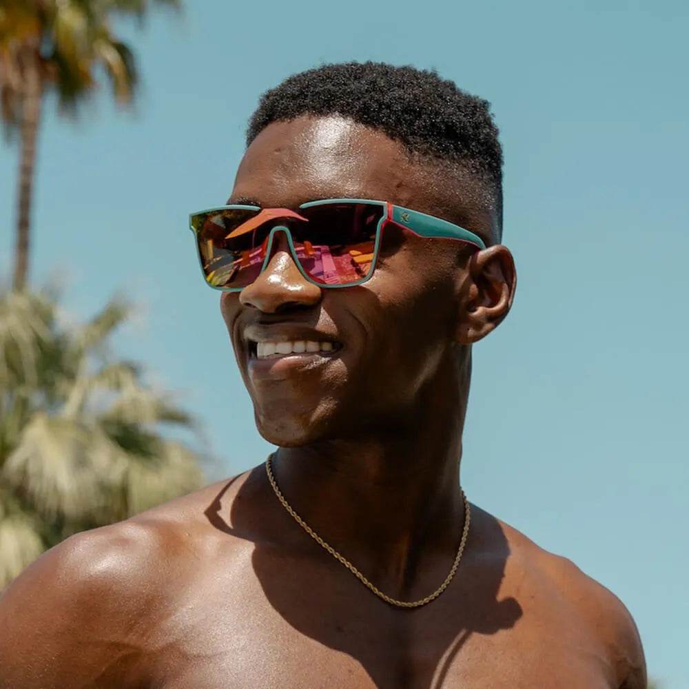 Like a blazing beach sunset over scenic waters, our Miami Afters came to PLAY. Hot pink inner frames are imbued with tropical magic for all the zesty action you’re destined for, while vibrant aquamarine arms & accents combine powers to make every head turn your way. Top the whole package off with a vivid pink sunset lens that offers UV400 protection and impact resistance, and it’s no wonder everyone wants to know where you got them. Share your secrets or don’t, since these neon sunglasses certainly aren’t for the faint of heart.