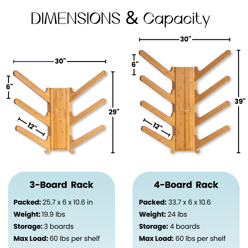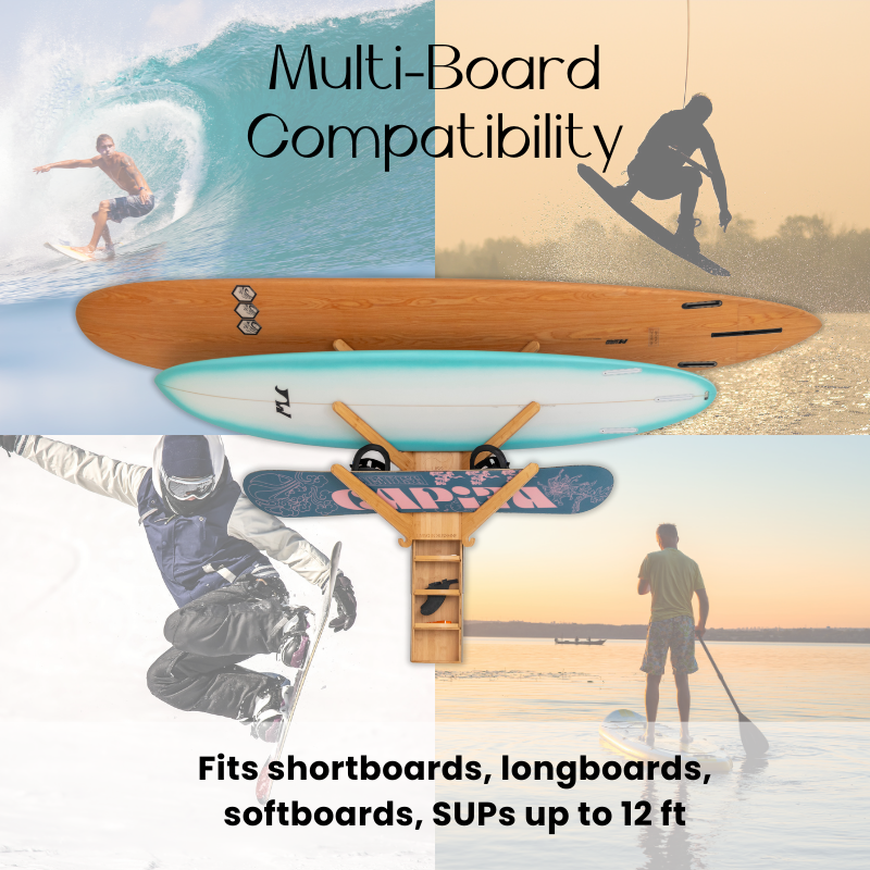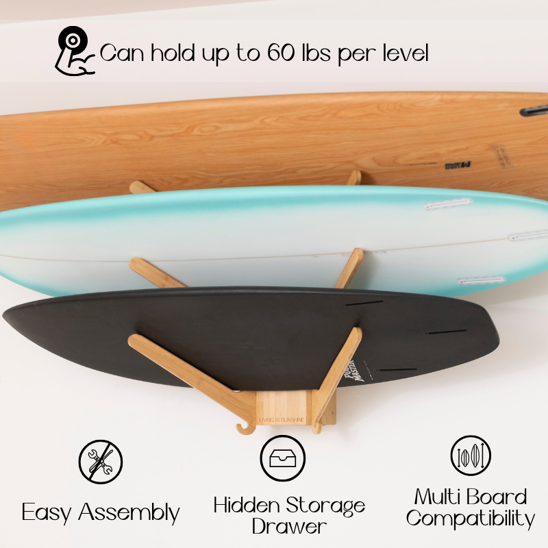 • Universal fit holds boards up to 10 ft and up to 60 lbs per shelf