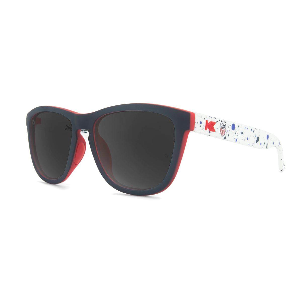 Modeled after the new USWNT jersey, this pair features a navy front over a red interior, while a blue splatter pattern paints a white base on each arm. Polarized smoke lenses, red K-logos, and the U.S. Women’s National Team crest round out this ready-to-win pair!