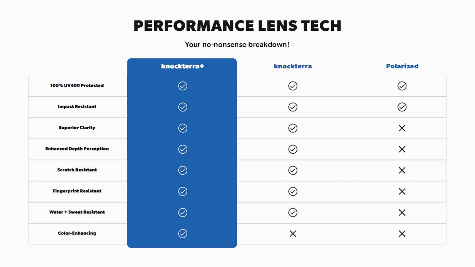 For those seeking the highest level of color enhancement available, the Knockterra+™ Lens Tech is a must have. Including all the features of Knockterra™ Lens Tech, such as water- and oil-resistant coatings, as well as a color enhancing filter, these ensure that greens really pop when you need it most.