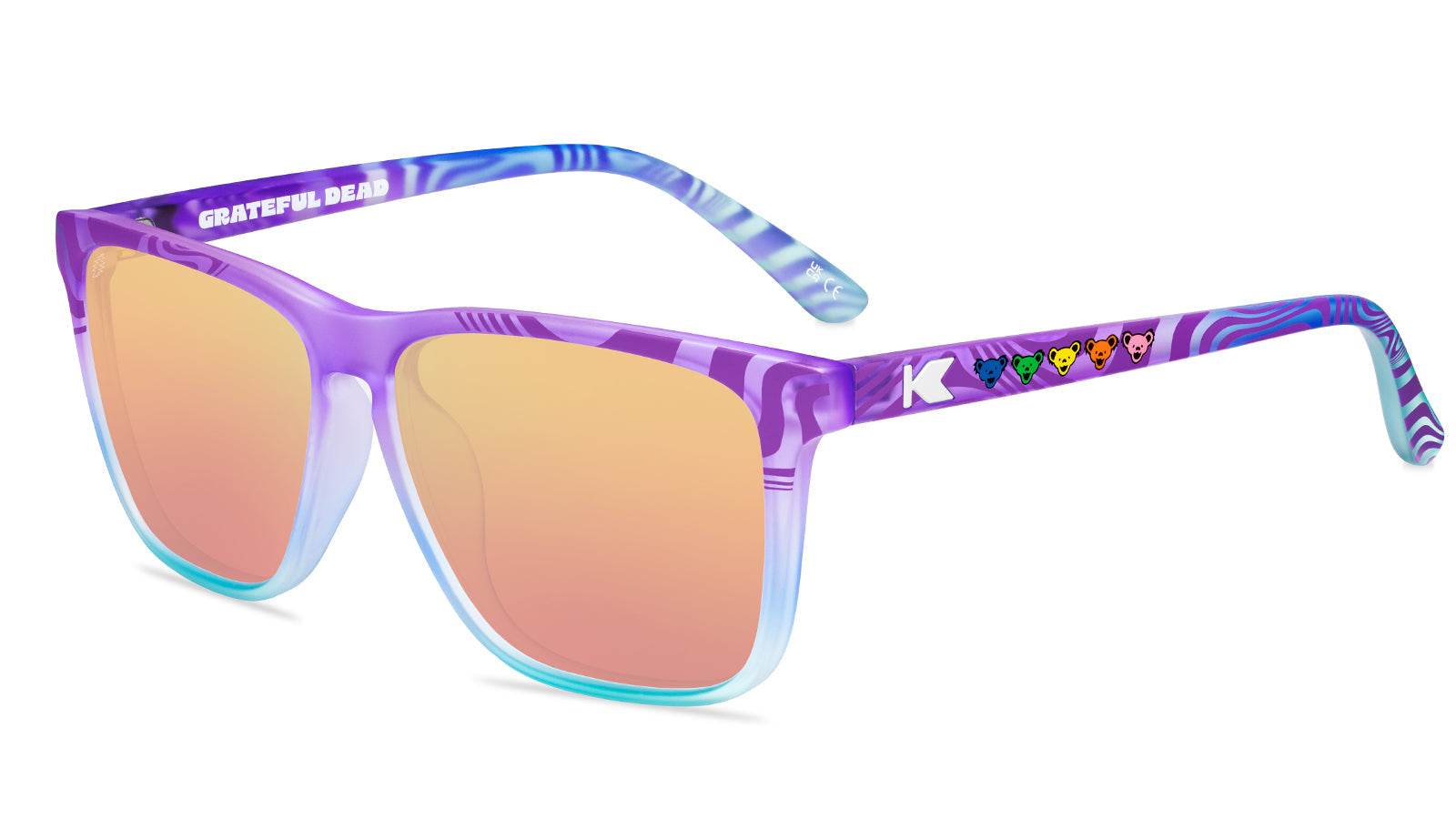 Step into a technicolor daydream with the Trippy Bears Fast Lanes! These shades swirl together frosted light blue and purple in a wavy pattern that’s pure visual bliss. Featuring the Grateful Dead’s iconic Dancing Bear heads along the arms, they’re a festival-ready trip down memory lane. Whether you’re chasing the music or just soaking up the sun, these shades will have you feeling far-out and fabulous wherever the groove takes you.