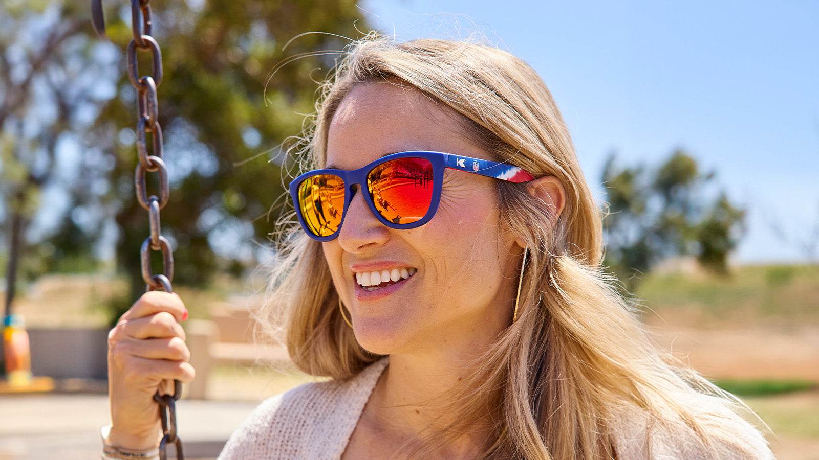 Inspired by the 2024 men’s and women’s U.S. Soccer away kits, these Premiums Sport sunglasses feature a blue-to-red transition, amplified by a white stripe tie-dye transition along the arms. Polarized red lenses, white K logos, and the U.S. Soccer crest round out this ultra-patriotic pair.