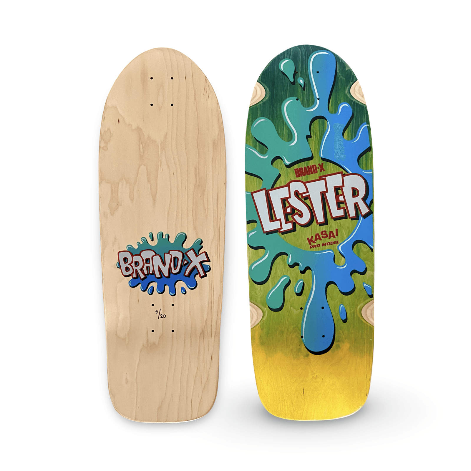 Brand-X Lester Kasai Deck - A recreation of Brand-X artist, Bernie Tostenson's art from 1983 - originally designed for Lester at Sims. Made on the original pig shape with amazing hand-done, screen-printed graphics with a killer gradual fade stain deck and silver metallic ink.