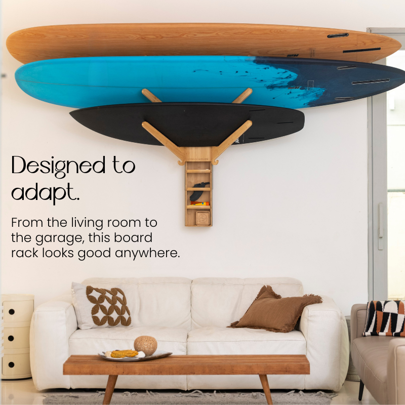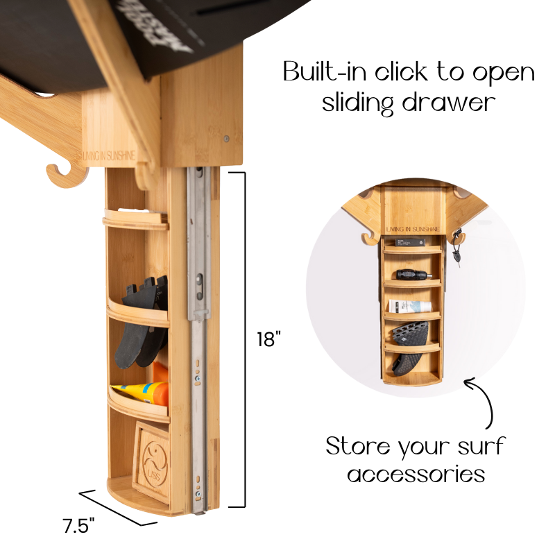 • Built-in drawer shelf keeps fins, wax, and essentials organized and within reach