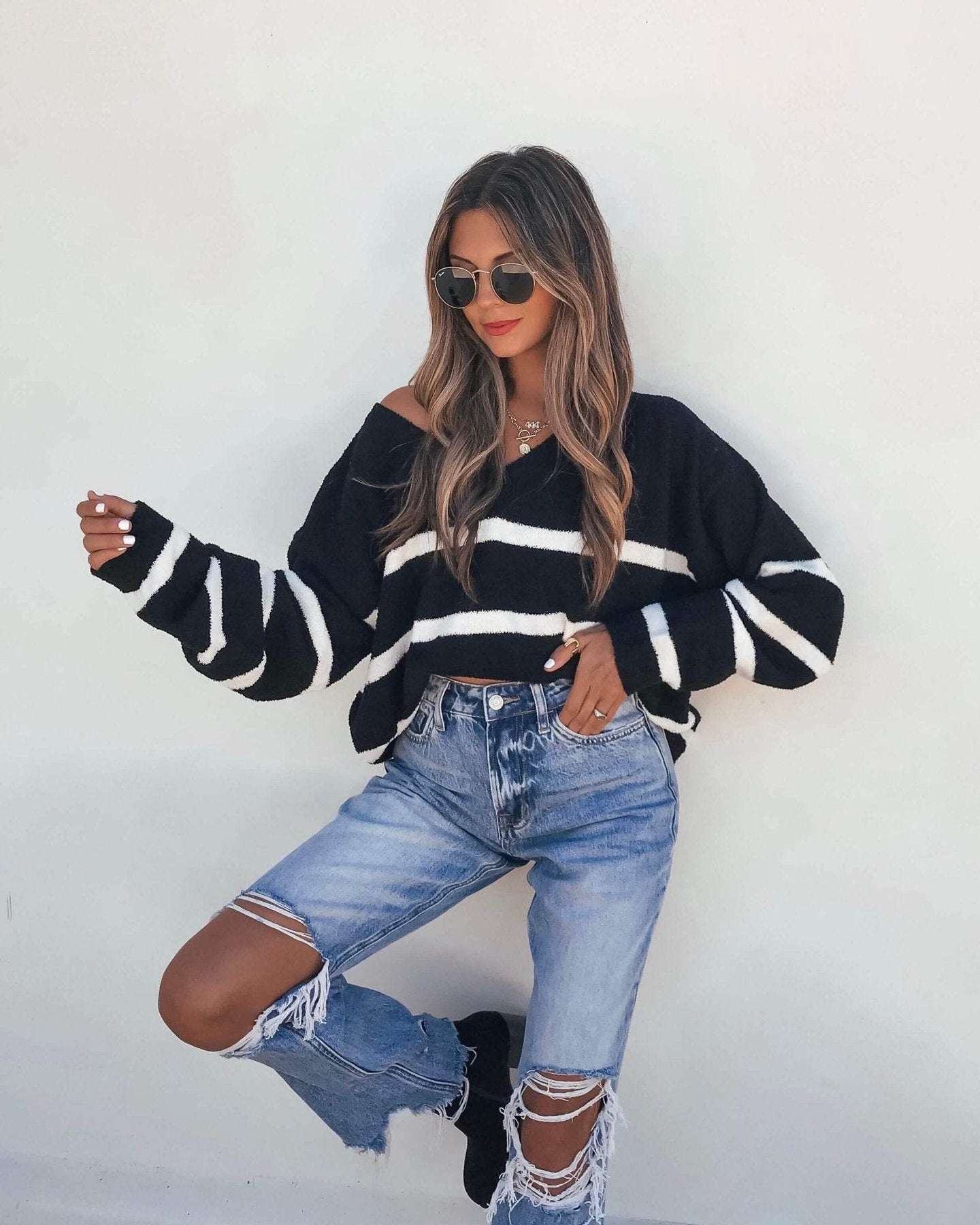 Expertly crafted with a bold black and white striped design, this V neck sweater brings both style and comfort to your wardrobe. Made from high-quality materials, it offers a flattering fit and is perfect for any occasion. Simply style it with jeans, ankle booties, and simple accessories for a chic fall look.
