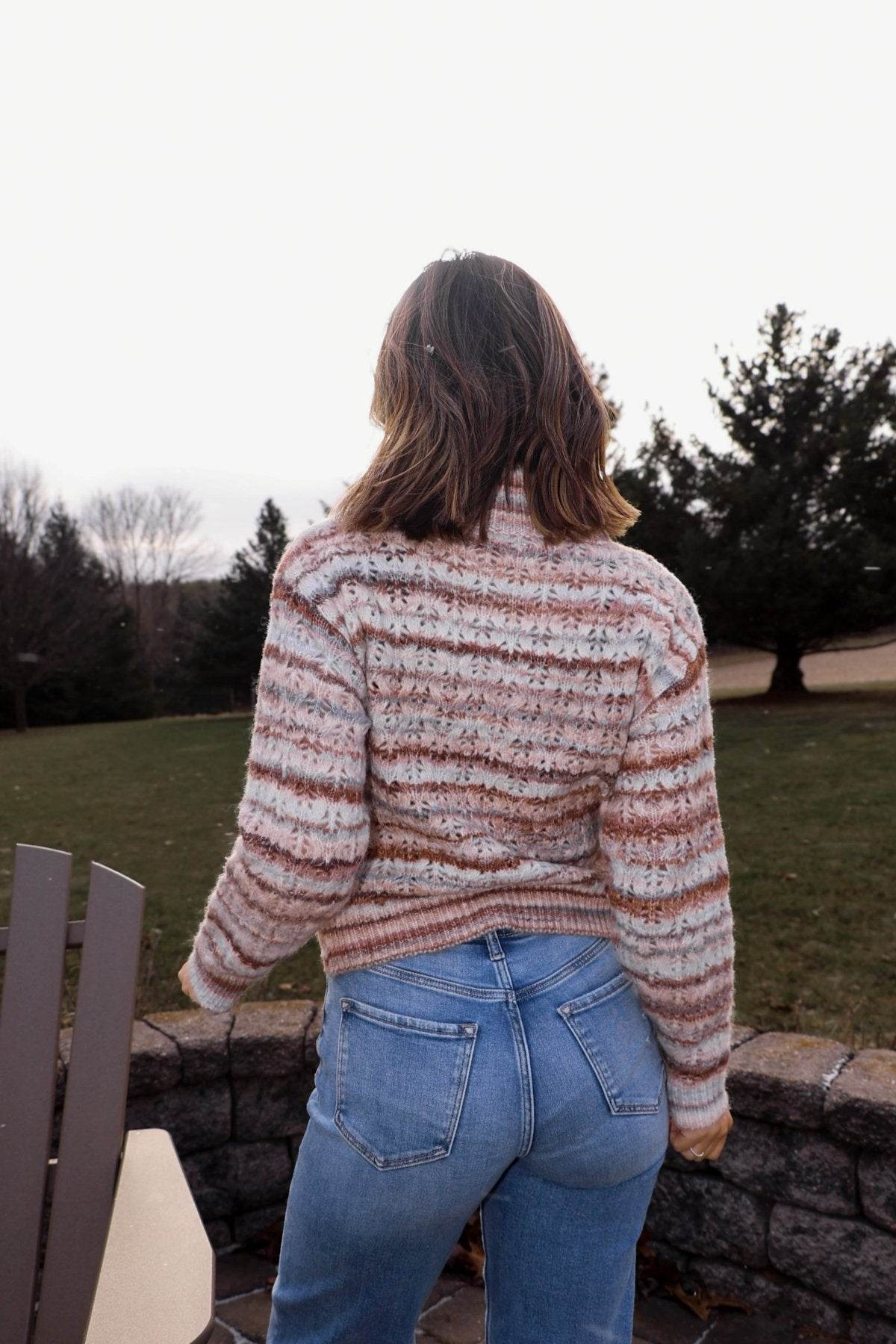 The multi color design adds depth and dimension to your fall wardrobe. Features a half zip up front, offering a customizable fit and a versatile look. The striped pattern gives it a textured finish, blending comfort and style effortlessly. Pair with your favorite jeans or leggings for an easy, go-to look that transitions seamlessly from day to night