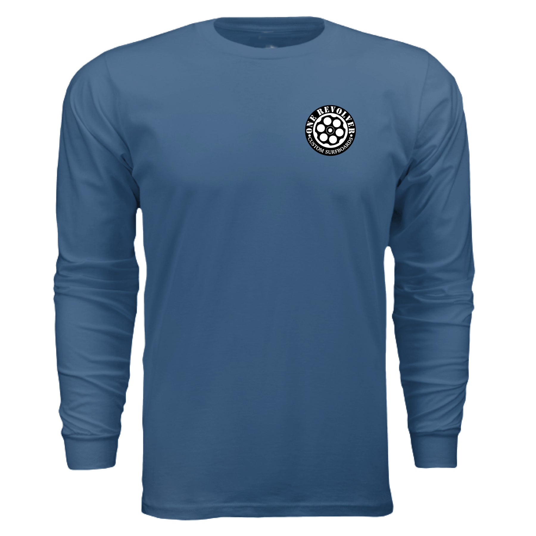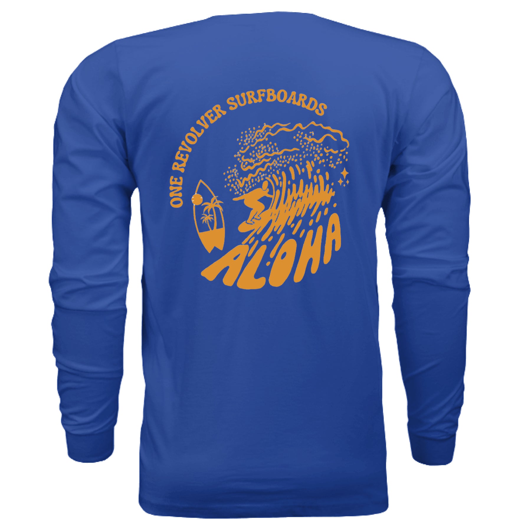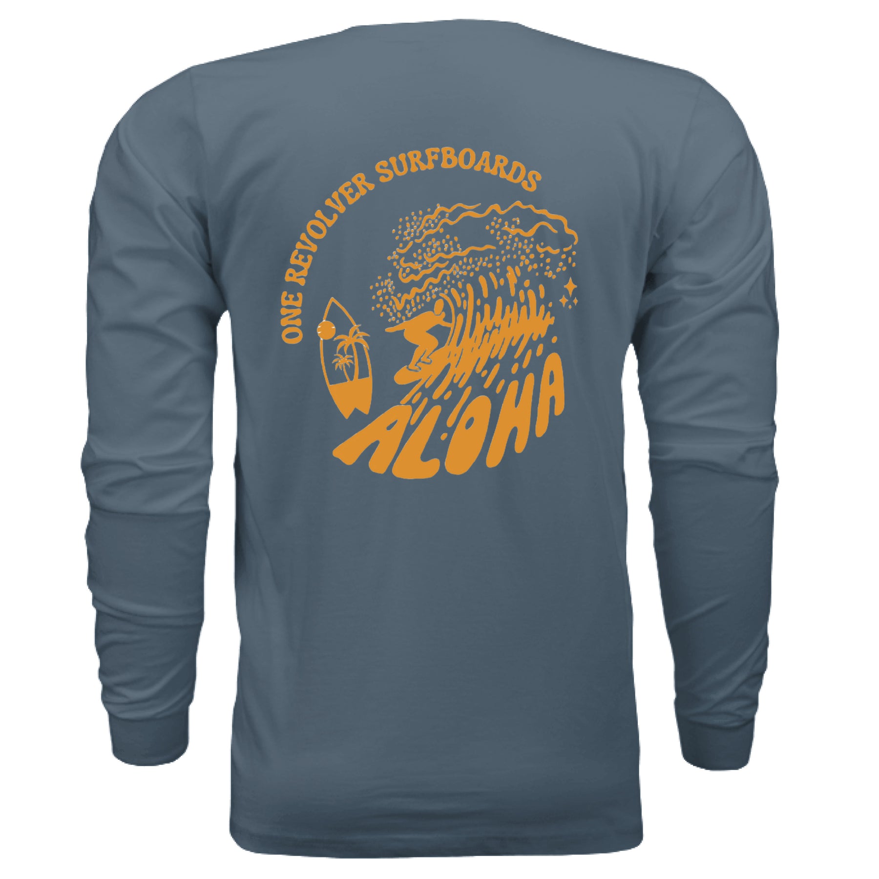 The One Revolver Surfboards Retro Aloha Long-Sleeve Shirt brings 70s surf energy into the present with a bold dot-art wave graphic and vintage lettering. Designed for layering or wearing solo, it’s perfect for early morning surf checks, campfire hangs, or any laid-back coastal day.