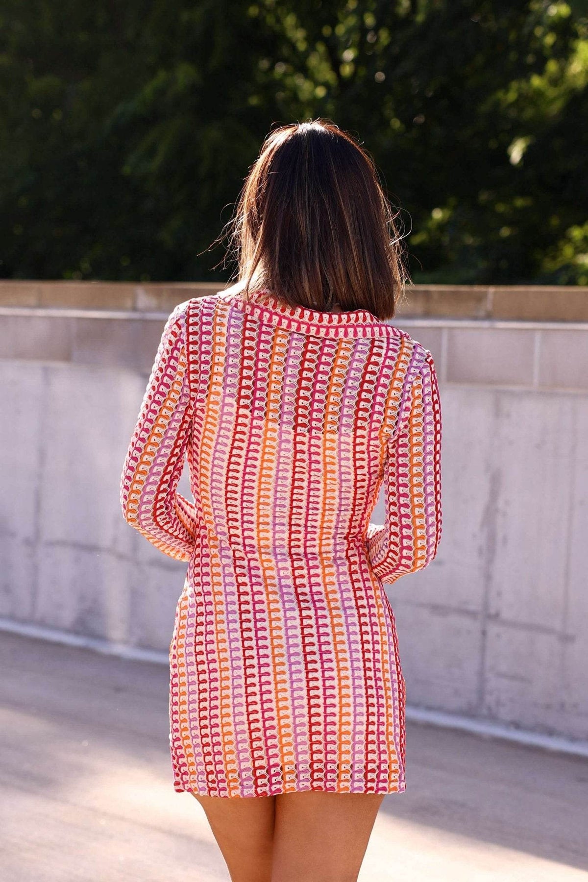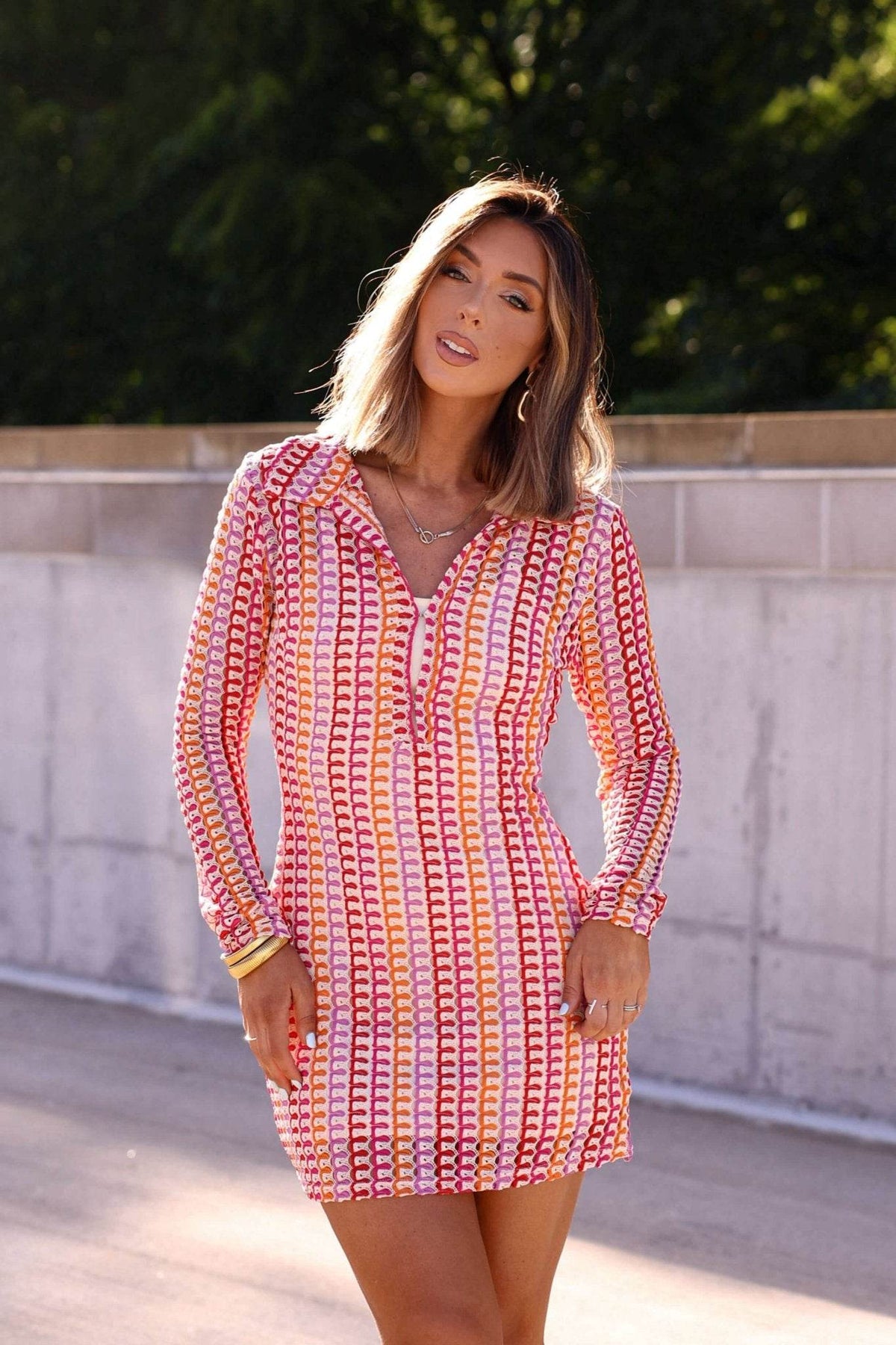 Designed with an allover crochet material and bold multi-stripe pattern, this dress features a collared V neckline with a subtle hook closure and comes with a removable cream slip that includes adjustable cami straps for customizable comfort. Whether worn solo as a breezy beach cover-up or layered for weekend brunch, this mini length style delivers summer-ready versatility. Pair it with sandals and chic sunglasses for an effortlessly cool, coastal look.