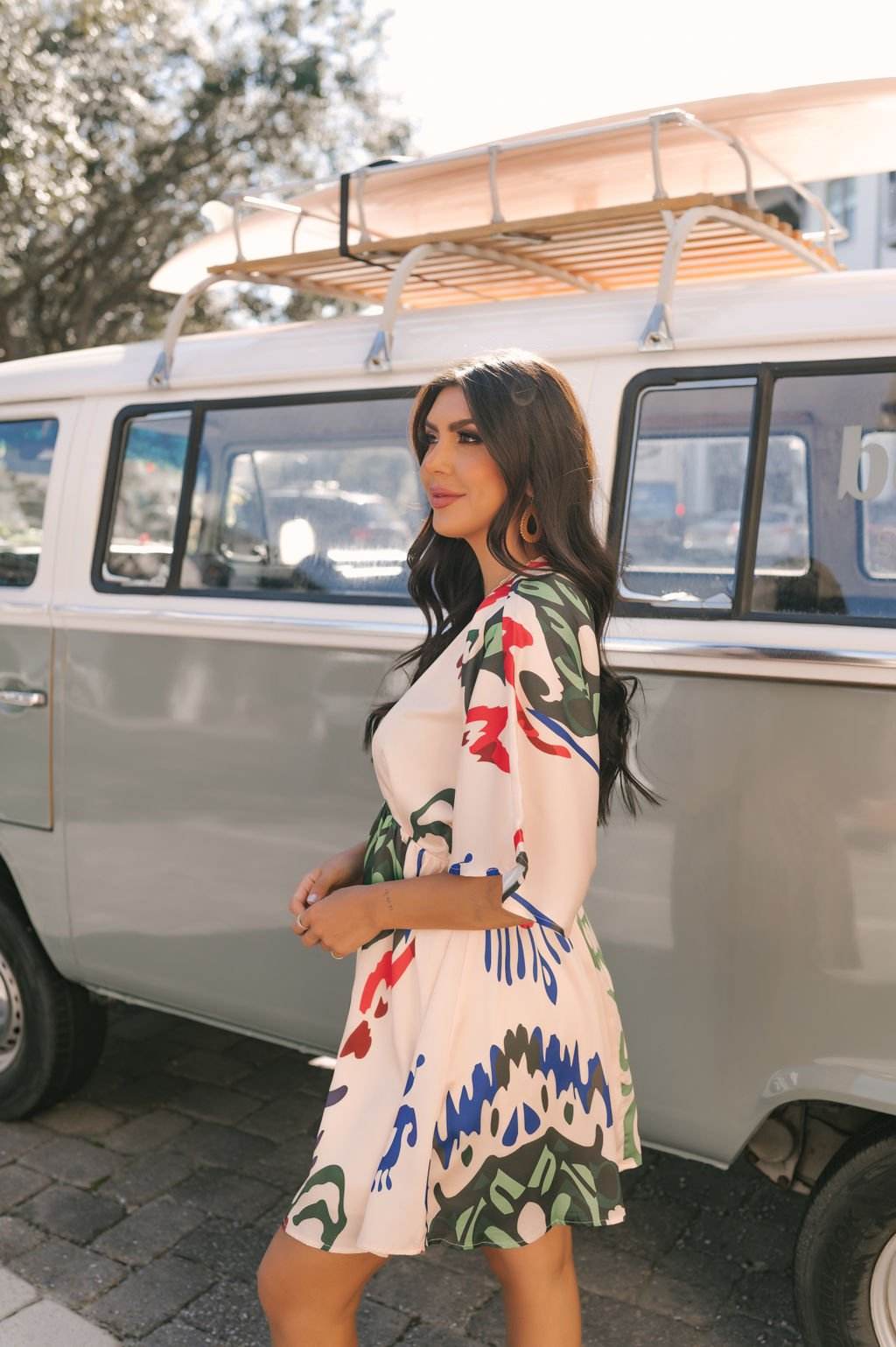 Our Natural Print V Neck Mini Dress is a chic and versatile piece that is sure to become a staple in your closet! With its neutral color palette and classic print, this dress is perfect for a variety of occasions. Dress it down with sandals and a wide brim hat for a relaxed daytime look, or elevate it with heels and statement jewelry for a chic evening ensemble.