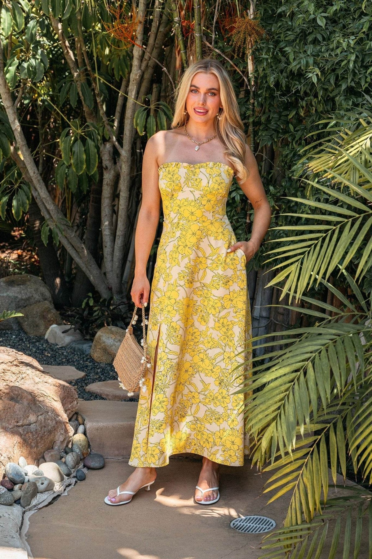 Featuring a strapless design and empire waist, this feminine silhouette flatters with ease. A ruffled bust hem and lace-up back add romantic charm, while the side slit gives it a breezy, flirty finish. The allover floral print makes this midi dress perfect for spring soirées, wedding guest looks, or sunset dinners. Partially lined with a side zipper and hook closure for a seamless fit. Style it with dainty heels, a clutch, and tousled waves for an effortlessly dreamy look.