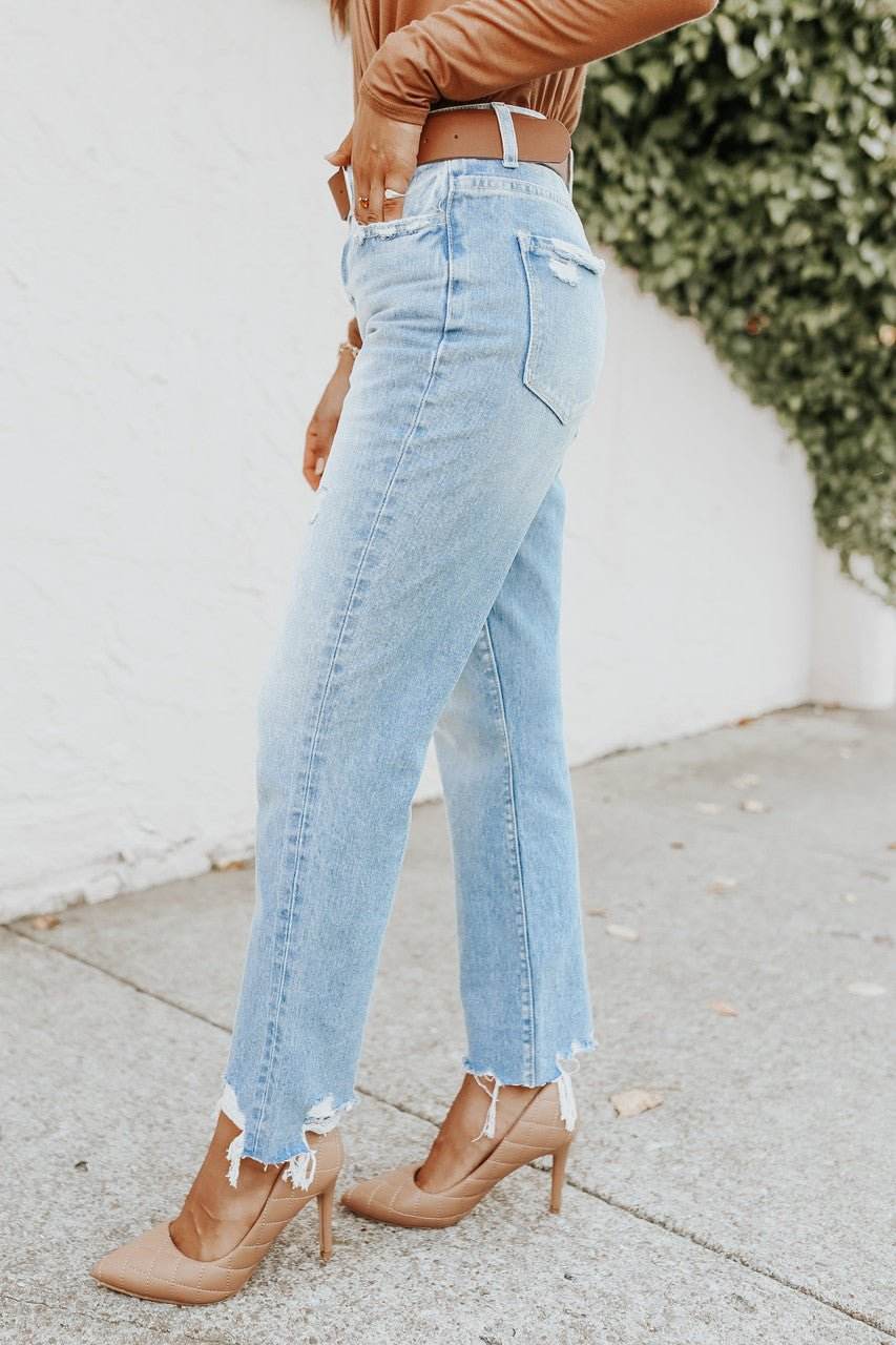 It doesn't get better than our Angie Distressed Light Wash Straight Leg Jeans! These light wash high waist jeans from Flying Monkey feature distressing and come in a straight leg style. These jeans will look great with any basic top and heels. The straight leg and heels will accentuate your figure for a natural slim look.