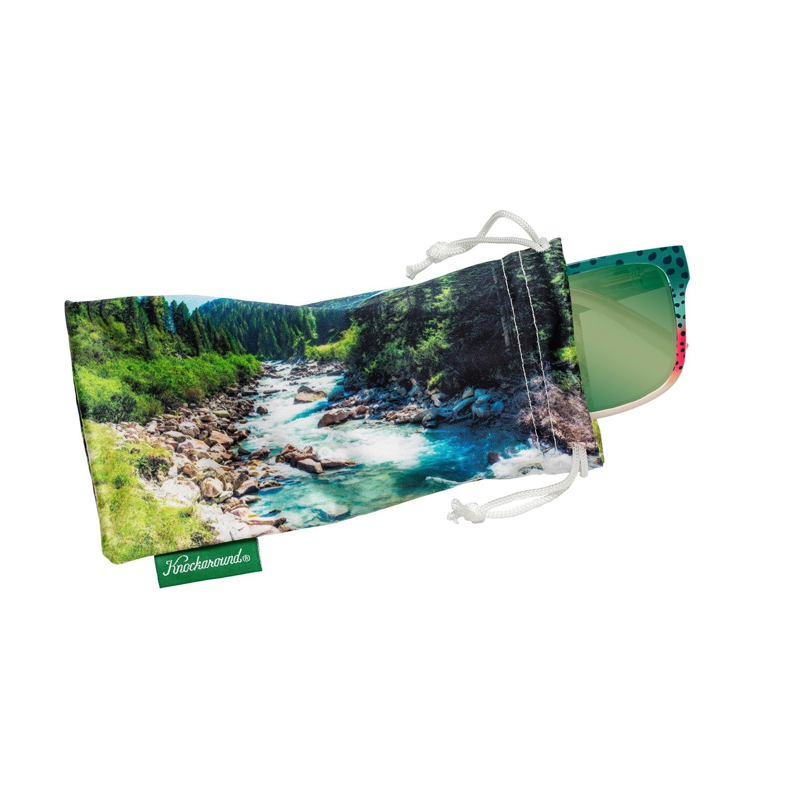 The Rainbow Trout Torrey Pines Sport sunglasses bring the vibrancy of the wild to life. Blue-green at the top of the speckled frame fades gently to crimson before ending in translucent beige along the arms. Top it off with a light blue interior for a look that comes straight from the streams of Montana. Polarized olive green lenses etched with a rainbow trout silhouette provide optimal glare reduction, making them as functional as they are eye-catching. Finished with silver K logos and pink embedded rubber nose pads, these shades combine rugged style with superior comfort. With FDA compliant, impact-resistant lenses and full UV400 protection, they’re ready for any adventure and come with a babbling river microfiber pouch for safe keeping.