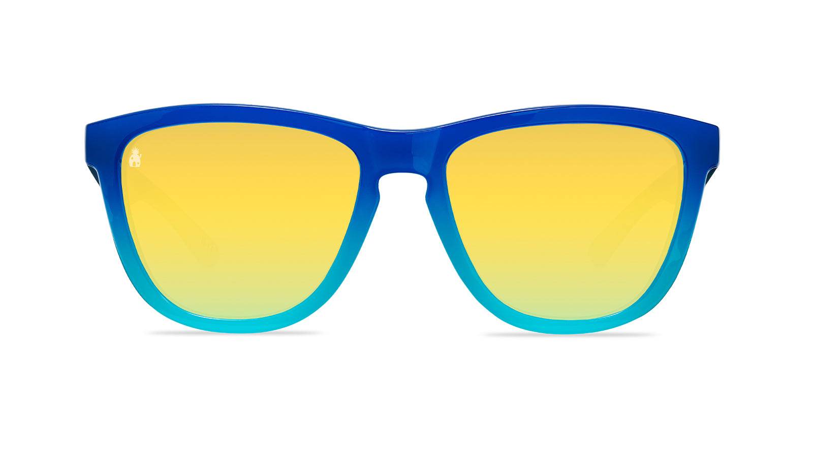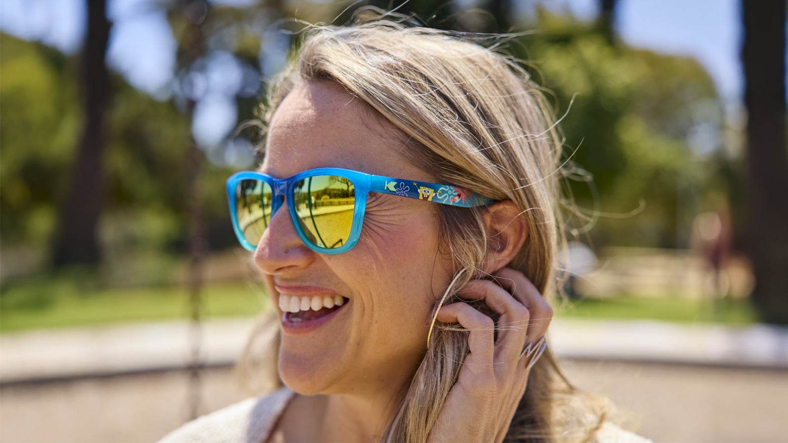 Who lives in a pineapple under the sea? These shades do now! The SpongeBob SquarePants Premiums take inspiration from the optimistically colorful world of Bikini Bottom. A deep sea fade frames polarized ocean sunrise lenses in the front, while each arm features SpongeBob and his BFF Patrick with Bikini Bottom’s iconic flower clouds in the background. Seafoam green K logos and a pineapple house lens etch round out this playful pair.