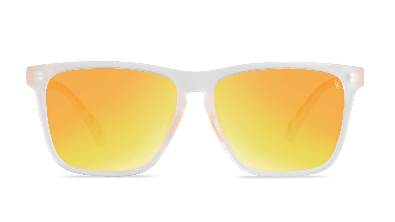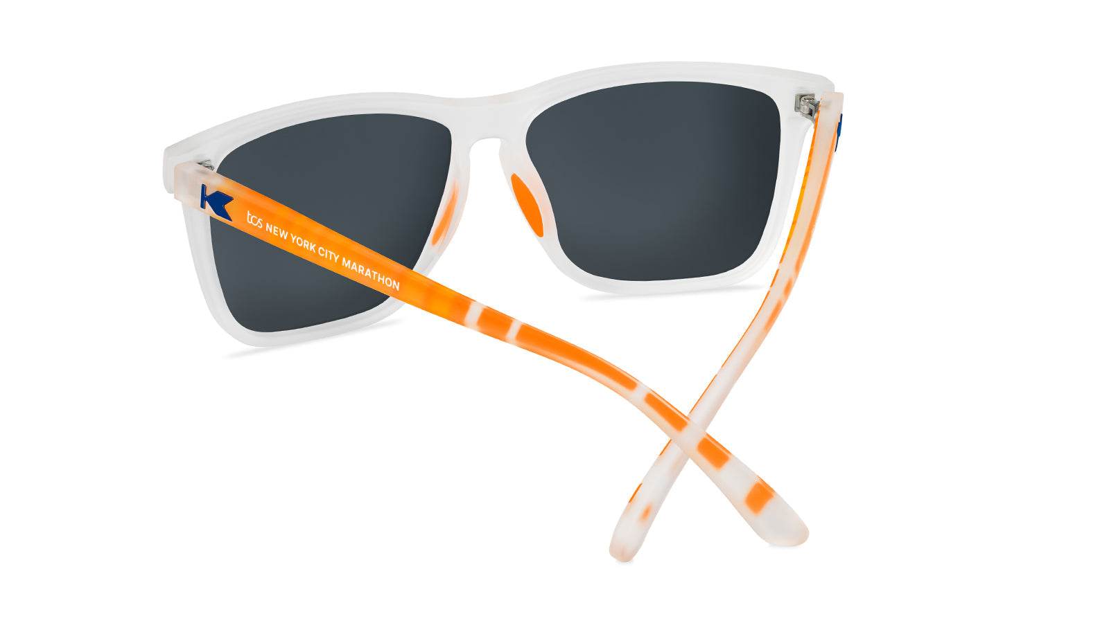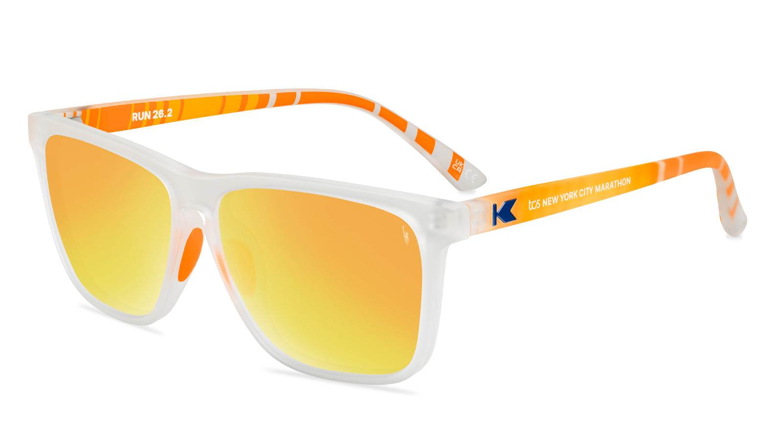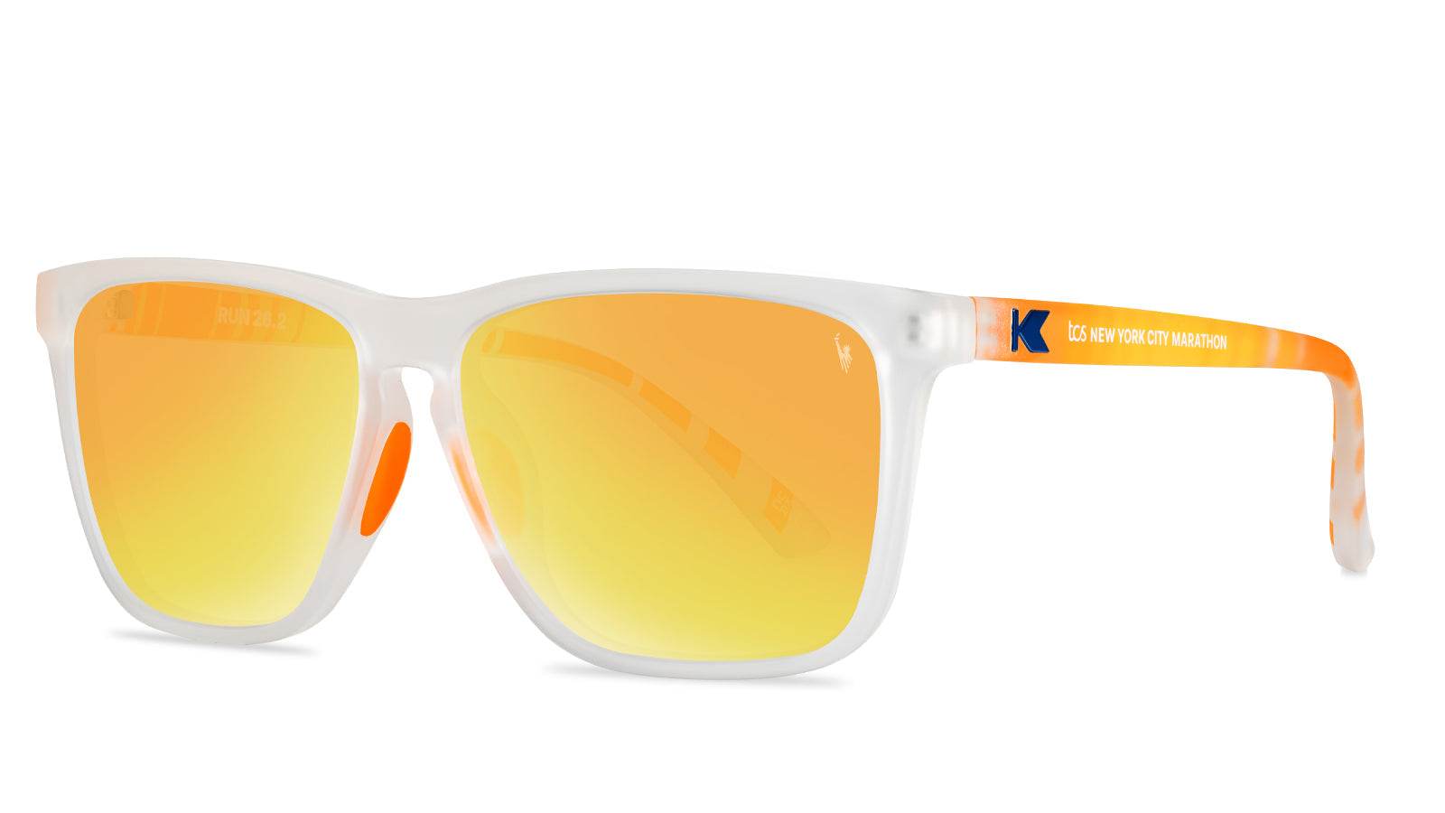 Set on the Fast Lanes Sport frame, they present an opaque clear front paired with striking opaque orange arms, accented by blue K logos. Polarized orange sunset mirrored lenses ensure clarity and protection, while rubber nose grips provide a secure fit through every stride. A Lady Liberty lens etch commemorates this enduring tradition, a reminder of the strength and spirit that defines New York City. Timeless design. Legendary race. An iconic pair to remember it by.