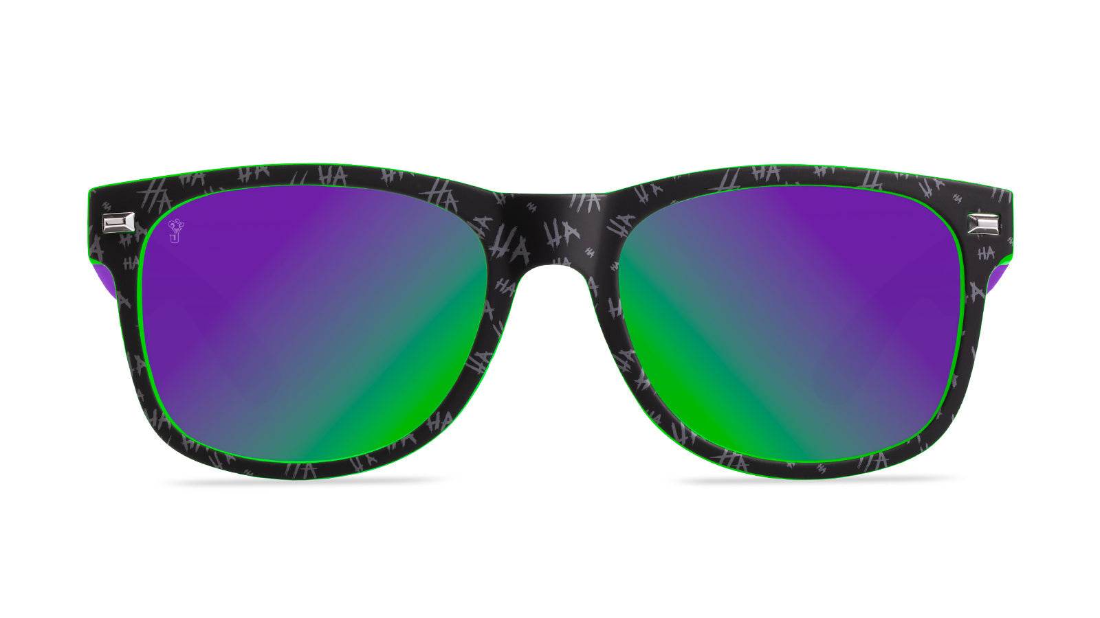 Chaos never looked so cool. The Joker Fort Knocks channel Gotham City’s crown prince of chaos with a punchy green and purple colorway straight from the asylum. Built on our best-selling Fort Knocks frame, these shades feature spring hinges for all-day comfort and a larger fit that’s no joke. Polarized purple-green nebula lenses cut the glare while you stir the pot. Whether you're plotting mayhem or just making your daily rounds, these sunglasses add a wicked twist to your style. Slip ’em on—and remember, it's always fun to watch the world burn (just a little).