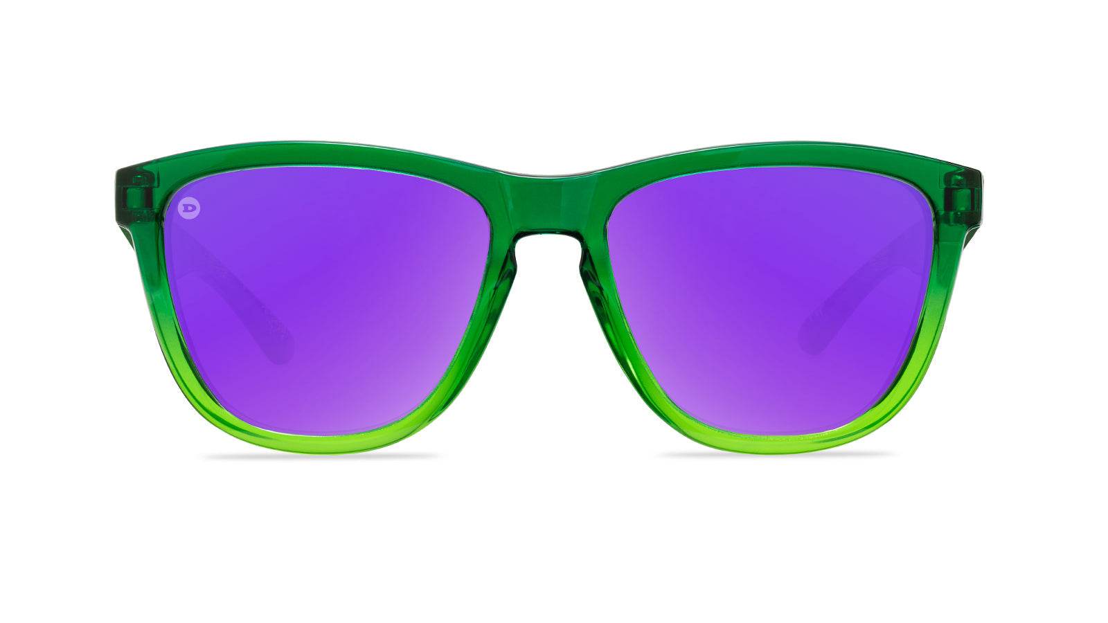 Inspired by the fearless antics of the Teenage Mutant Ninja Turtles and designed on our Premiums frame style, these sunglasses are as bold and exciting as a slice of pepperoni pizza after a sewer skate session. With vibrant semi-transparent green frames that scream "Cowabunga!" and arms that flaunt classic comic strip scenes, these shades aren't just sunglasses—they're a portal to adventure. Polarized purple lenses, reflecting Donatello’s brainy brilliance and inventive style, block any city-sun glare, while detailed graphics bring the tech genius right to your style-sidekick arsenal. “Radioactive” green K logos and the iconic TMNT logo on the inside of the arm round out this shell-shockingly cool pair of shades.