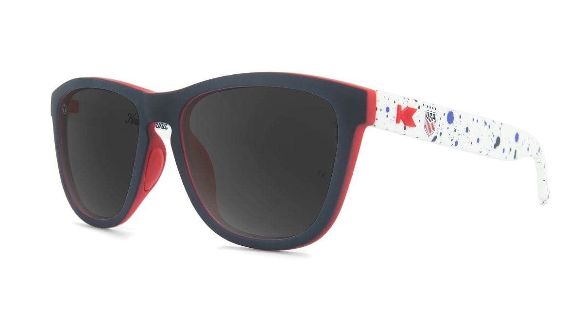 Modeled after the new USWNT jersey, this pair features a navy front over a red interior, while a blue splatter pattern paints a white base on each arm. Polarized smoke lenses, red K-logos, and the U.S. Women’s National Team crest round out this ready-to-win pair!